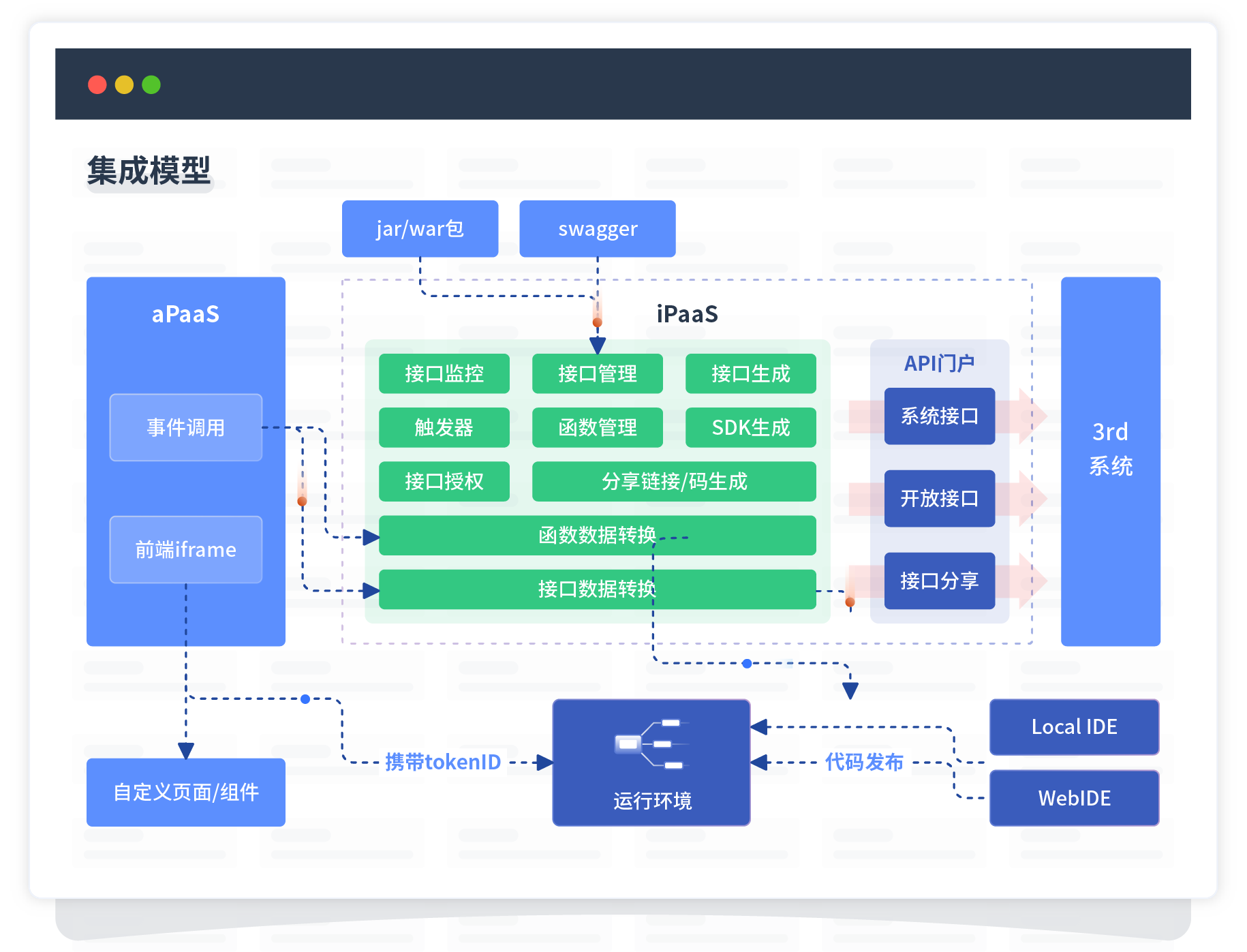 集成模型包括平台本身前、、、、、、、、、、后端能力的扩展,,,,,,,,,,,,,也支持通过API门户和第三方系统进行交互。。。。。。