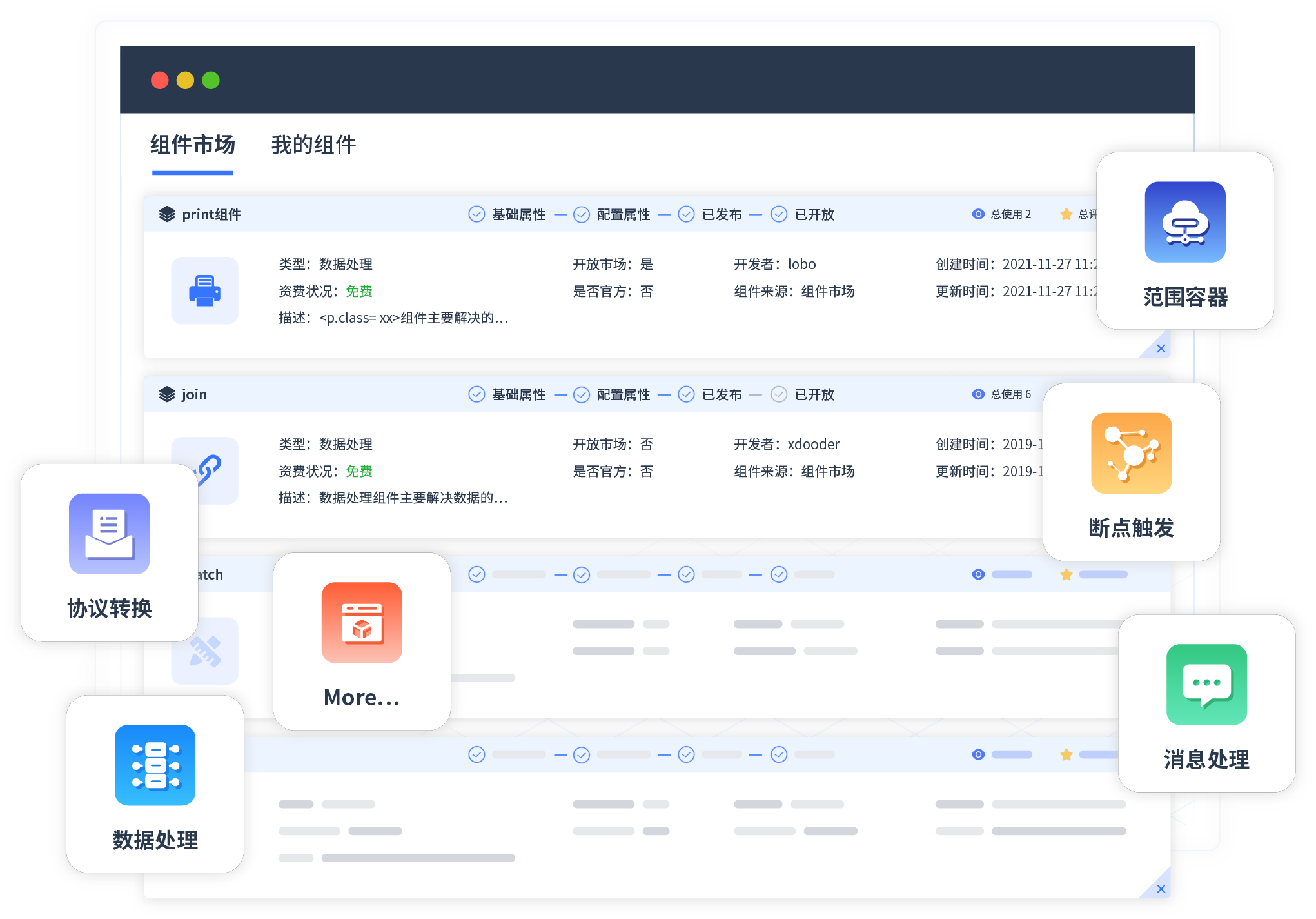 针对集成场景,,,,VIVO钱包提供组件市场,,,,,,例如协议转换、、、、、、、、、、、消息处理、、、、、、、、、文件操作等。。。。。。。。。。。。。。。除平台提供的组件外,,,,,,,,,,客户可以自定义所需组件。。。。。。。。。。。。